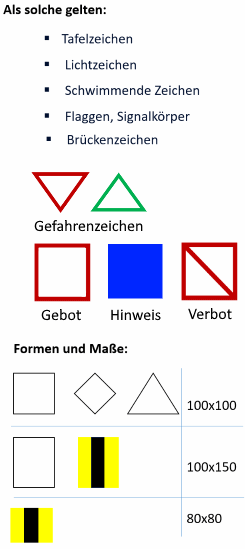 SCHIFFFAHRTSZEICHENSchifffahrtszeichen Als Schifffahrtszeichen gelten: Tafelzeichen, Lichtzeichen, Schwimmende Zeichen, Flaggen, Signalkörper. 1. Die Hauptzeichen können durch die Zusatzzeichen ergänzt oder erläutert werden. 2. Die Tafeln können mit einem schmalen weißen Streifen eingefasst werden. 3. Die Abmessungen und die Farben müssen den geltenden Empfehlungen der Donaukommission entsprechen. Schifffahrtszeichen die als Tafeln ausgeführt sind werden unterteilt in: Brückenzeichen, Gefahrenzeichen, Gebotszeichen, Hinweiszeichen, Uferzeichen, Verbotszeichen, Zusatzzeichen. Als Zusatzzeichen gelten: Eine Aufstellung aller Zeichen findet sich auf der Startseite unter Schilder. |